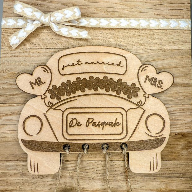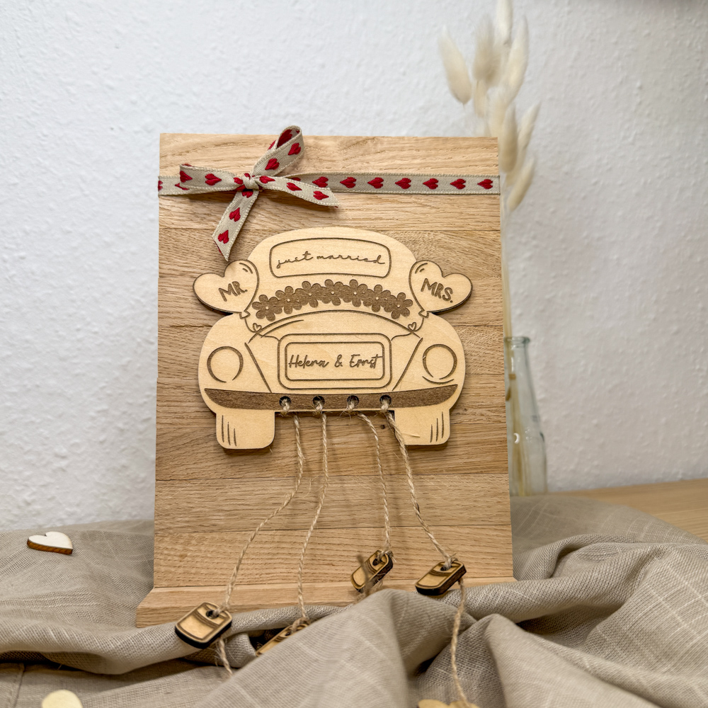 Hübsch verpackt kommt dein Geldgeschenk mit unserem Wandschild/Aufsteller „Just married“ daher. Anstelle der klassischen Blechdosen zieht das aus Holz gelaserte Hochzeitsauto mit den herzförmigen Ballons „Mr.“ Und „Mrs.“ Geldscheine hinter sich her. Und das Beste: Ihr könnt das Nummernschild des Autos nach euren Wünschen personalisieren: Trägt das Brautpaar ab sofort den selben Nachnamen? Falls nicht, machen sich auch die Initialen oder die vollständigen Vornamen wunderbar auf dem Nummernschild.
