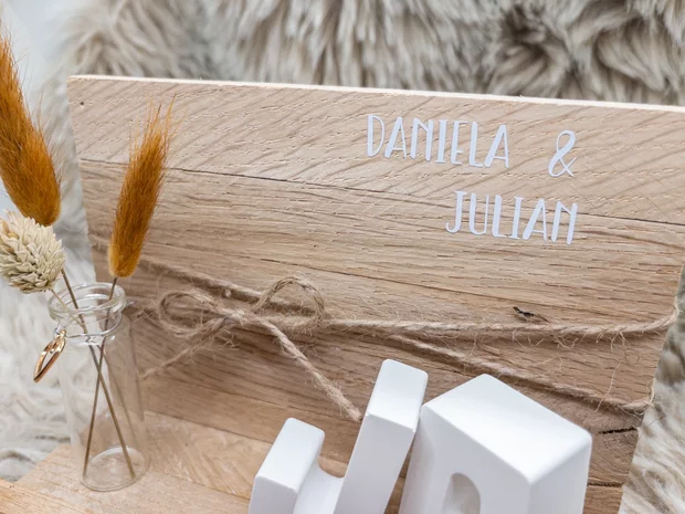 Dieser kleine aber feine Aufsteller ist ein echter Hingucker in der Wohnung und eine tolle Erinnerung an einen wundervollen Tag. Der Schriftzug wird aus einer Spezialfolie von einem Plotter ausgeschnitten und in Handarbeit aufgeklebt.