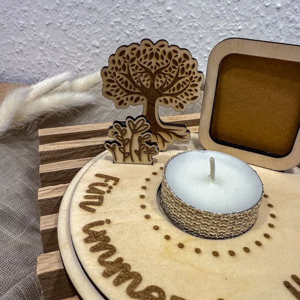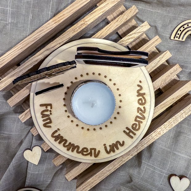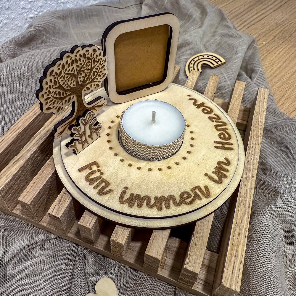 Der Aufsteller wird in Handarbeit aus hellem Holz gefertigt und enthält kleine Details wie einen filigranen Lebensbaum, eine Miniatur-Szene mit Blumen und ein Steckfach für ein Foto. Das sanfte Licht in der Mitte unterstreicht den stillen Moment und schenkt eine wohlige Wärme in Zeiten der Trauer.