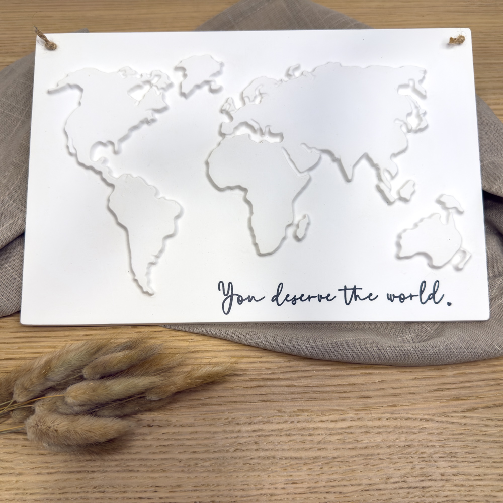 Alle Weltenbummler und Freunde ferner Länder und Kulturen werden sie lieben! In der Größe 20x30 cm findet sich für unsere aus Raysin gegossene Weltkarte nahezu in jedem Zuhause ein Plätzchen. Die Kontinente sind erhaben, wodurch sich (je nach Belichtung) ein schönes Licht- & Schattenspiel auf der Weltkarte ergibt. Der Schriftzug “You deserve the world” aus Vinylfolie ziert den unteren Teil der Weltkarte. Auf Wunsch kann die Karte mit einer Aufhängung aus Juteschnur ergänzt werden. Wer sie lieber mit einem Aufsteller hinstellen möchte, darf das gerne bei der Bestellung durchgeben.