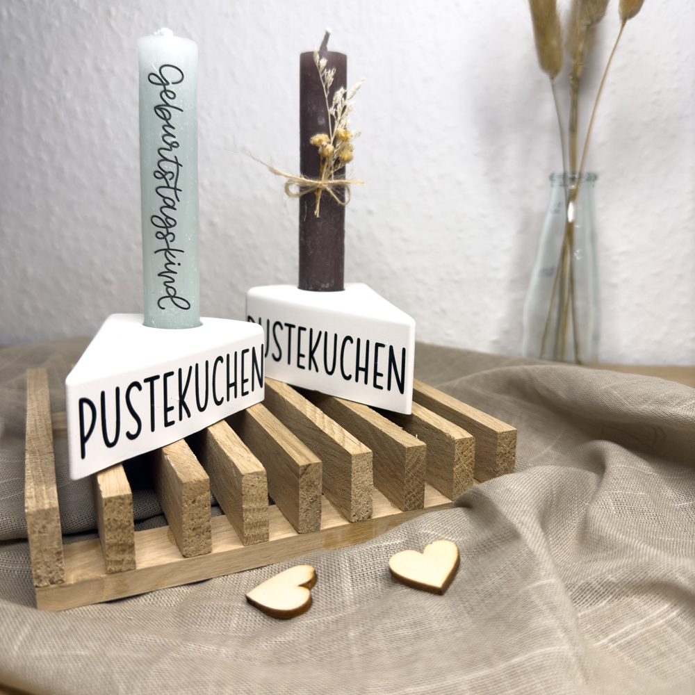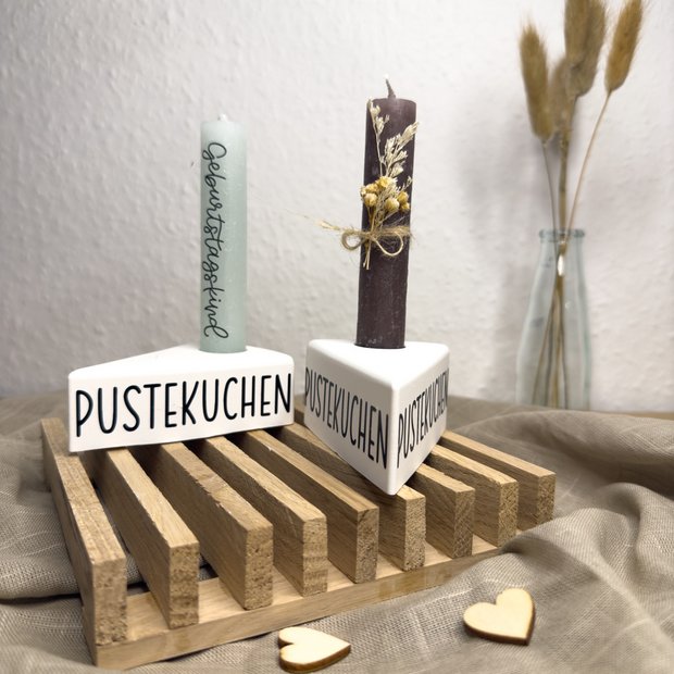 Pustekuchen! Dieses süße Törtchen eignet sich perfekt als kleine Aufmerksamkeit oder Beigeschenk für Geld und Gutscheine zum Geburtstag. Der Kuchen ist aus Raysin gegossen, auf beiden Seiten mit dem Wort “Pustekuchen” beschriftet und fungiert als Kerzenhalter. Die mitgelieferte Kerze ist mit dem Schriftzug “Geburtstagskind” versehen oder wahlweise mit einer Schleife und Trockenblumen dekoriert.